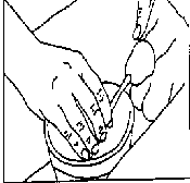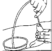 into a dish. If the catheter sticks just before it enters the bladder, wait a minute for the sphincter muscle