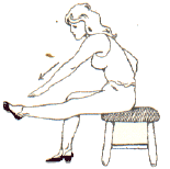 STRETCH ARM TO LEG (Improve flexibility in legs and lower back) : Sitting, extend one leg and slowly reach forward with the opposite arm, trying to touch the toes. Repeat to the other side. |